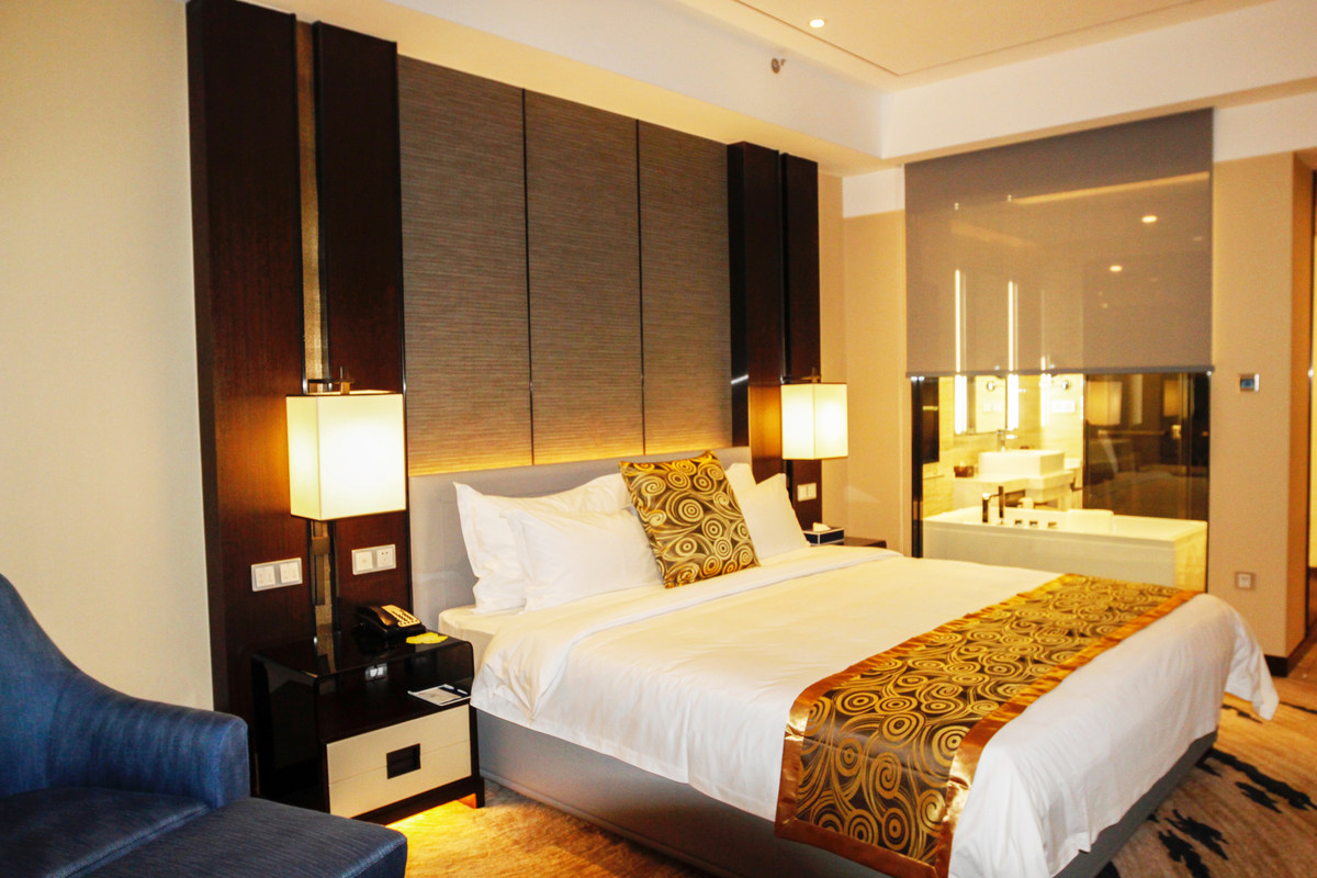 乾坤國(guó)際大酒店由湖北乾坤集團(tuán)投資建設(shè),坐落于湖北省孝感市東城區(qū)乾坤大道9號(hào),與乾坤購(gòu)物正對(duì)門,總建筑面積8萬(wàn)平方米,總投資6億元。地下室共二層,設(shè)有500個(gè)停車位以及完善的配套設(shè)置、車牌自動(dòng)識(shí)別系統(tǒng)、停車場(chǎng)智能管理系統(tǒng)、車位引導(dǎo)系統(tǒng)。裙樓一層大堂裝修成型后凈高15米,豪華氣派,設(shè)有大堂吧、全日制西餐廳、特色餐廳,一次性可容納600人同時(shí)進(jìn)餐。裙樓二層為中餐廳,一次性可容納600人同時(shí)進(jìn)餐。裙樓三層設(shè)一個(gè)大型多功能廳及會(huì)議室,多功能廳面積1400平方米、無(wú)柱,裝修成型后凈高10米,一次性可容納800人同時(shí)進(jìn)餐或1000人的大型會(huì)議。多功能廳配有120平方米的電子顯示屏、進(jìn)口高檔音響系統(tǒng)。裙樓四層為會(huì)議室,各種會(huì)議室共10個(gè),同時(shí)設(shè)有游泳池、健身房,設(shè)備設(shè)施齊全。主樓豪華客房、豪華套房共580間,并設(shè)置了無(wú)煙樓層和行政樓層及障礙房,設(shè)備設(shè)施齊全。