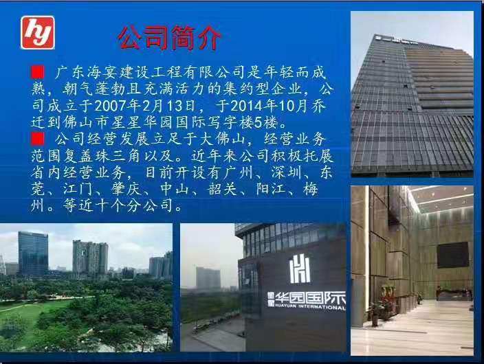 廣東海宴建設(shè)工程有限公司是一個年輕而成熟、朝氣蓬勃且充滿活力的集約型企業(yè),主要從事市政公用、排水、綠化、鋼結(jié)構(gòu)工程、橋梁工程、體育場地設(shè)施工程、城市及道路照明工程、爆破與拆除工程等綜合性施工企業(yè),企業(yè)注冊資本6000萬元,有各類專業(yè)技術(shù)人員90人,其中注冊建造師28人,高級工程師8人。在廣州、東莞、中山等設(shè)有九個分公司,且經(jīng)營狀況良好。