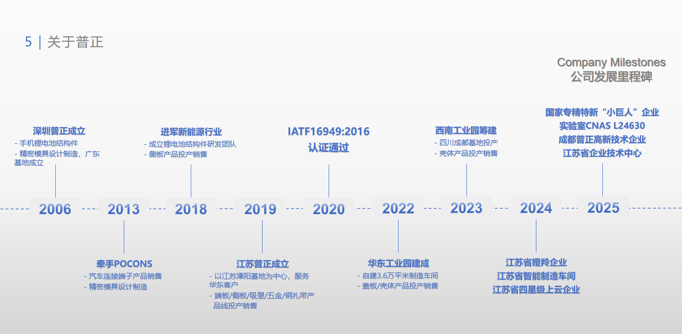 江蘇普正精密科技有限公司位于江蘇省溧陽(yáng)市竹簀鎮(zhèn),成立于 2019 年9月,注冊(cè)資金3000萬(wàn)元,現(xiàn)有員工500 余人。投產(chǎn)廠房面積廠房36000平方,榮獲國(guó)家專精特新"小巨人"企業(yè)、實(shí)驗(yàn)室CNAS L24630、成都普正高新技術(shù)企業(yè)、江蘇省企業(yè)技術(shù)中心。 主要經(jīng)營(yíng)范圍包括精密模具、五金制品、通訊電子連接器、電子塑膠制品、精密結(jié)構(gòu)電子零組件、工業(yè)智能設(shè)備的研發(fā)與銷售。汽車零部件及配件制造;汽車零配件批發(fā);模具制造;塑料制品制造;鍛件金屬制品銷售;通用零部件制造;金屬結(jié)構(gòu)制造。新能源汽車鋰電池結(jié)構(gòu)件一站式服務(wù)商。